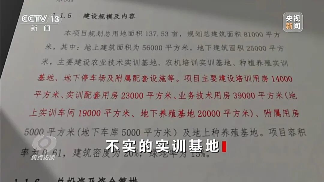 记者查阅项目备案文件,上面白纸黑字写着建设内容应为:农业技术、农机培训、种植养殖三大实训基地及相关配套。
